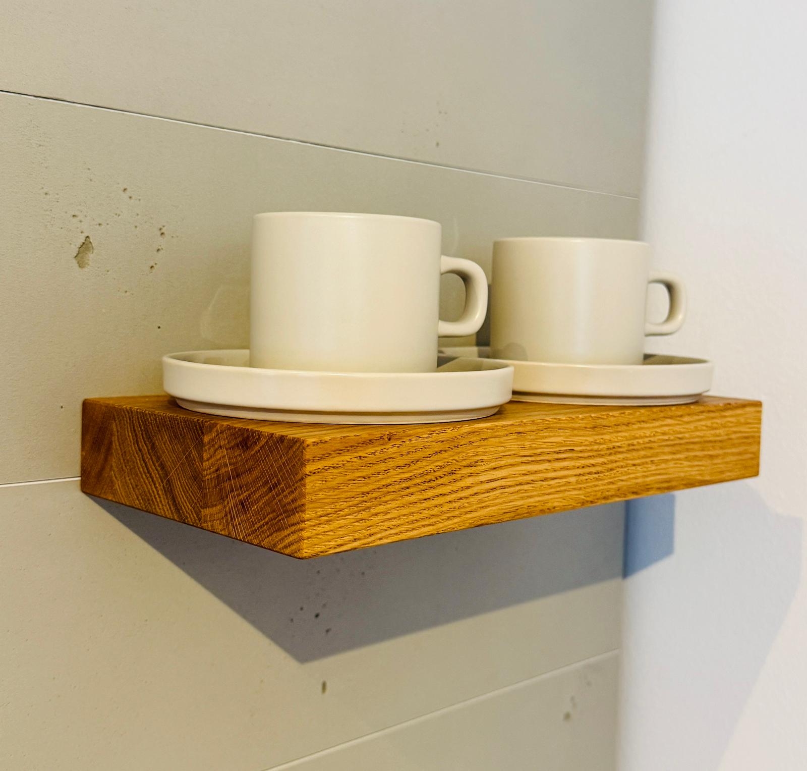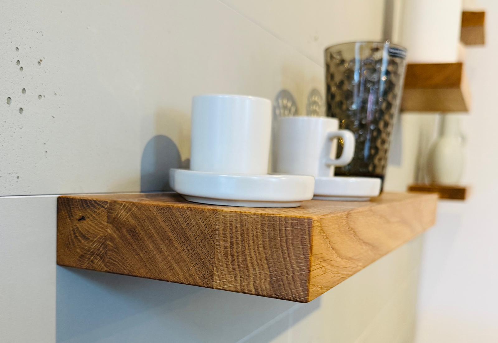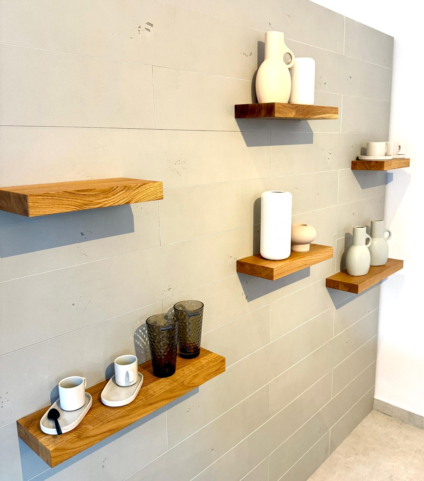Bringen Sie natürliche Eleganz in Ihr Zuhause mit unseren schwebenden Wandregalen aus massiver Eiche – für ein stilvolles und funktionales Ambiente!