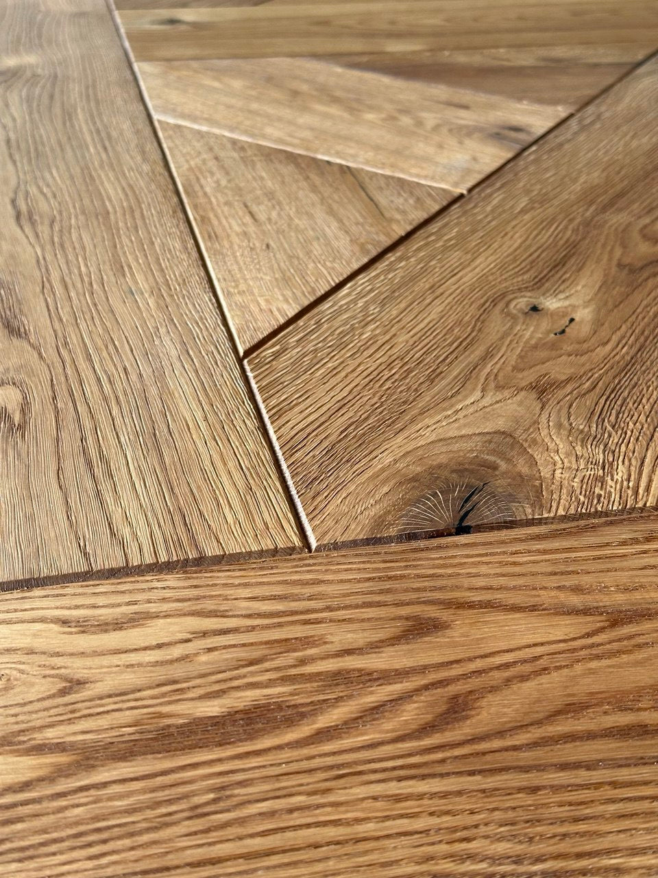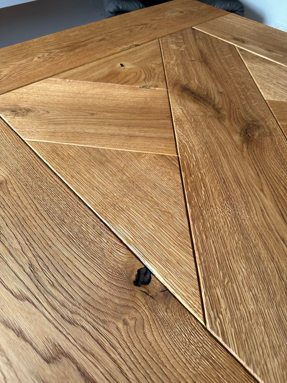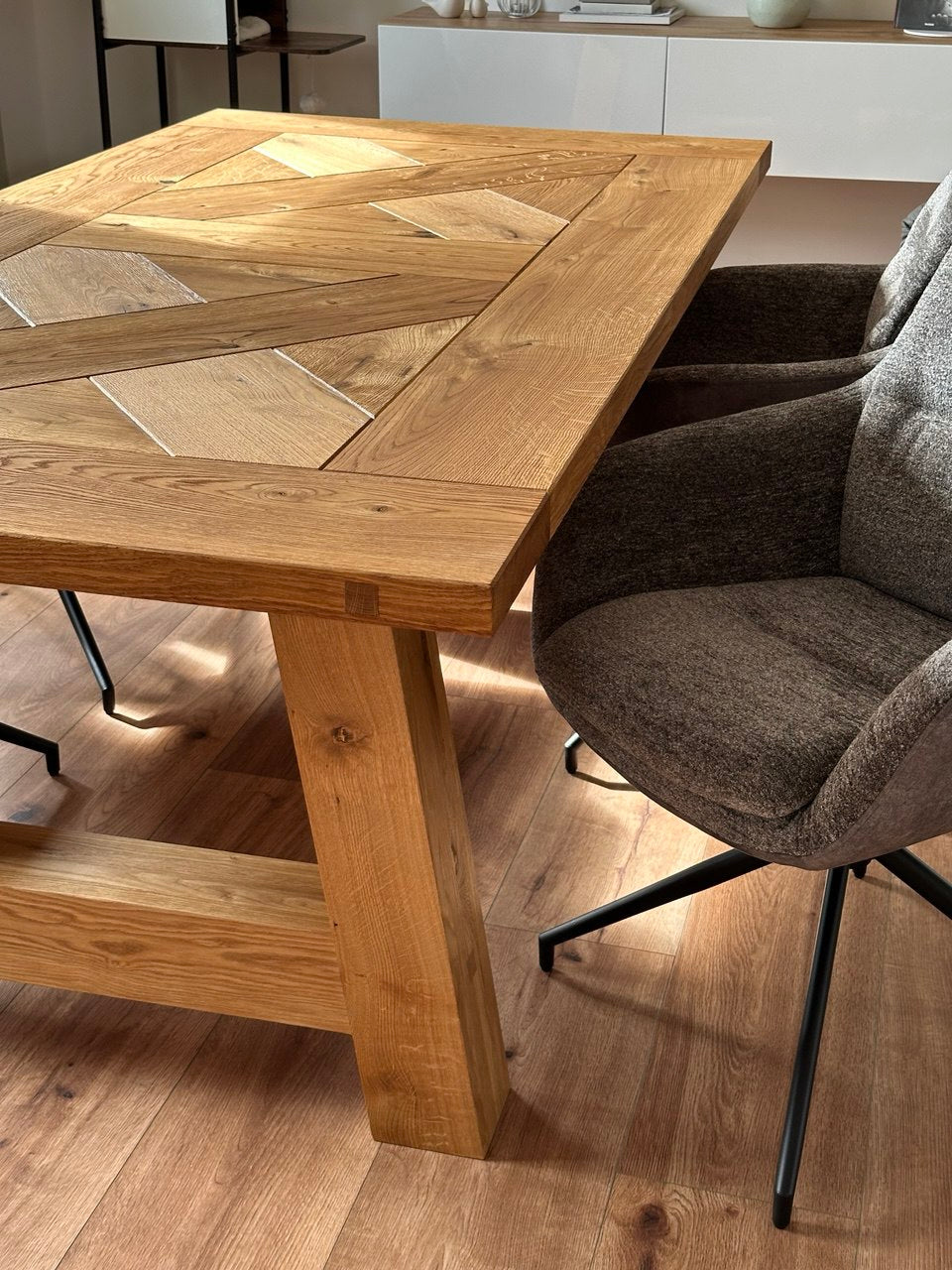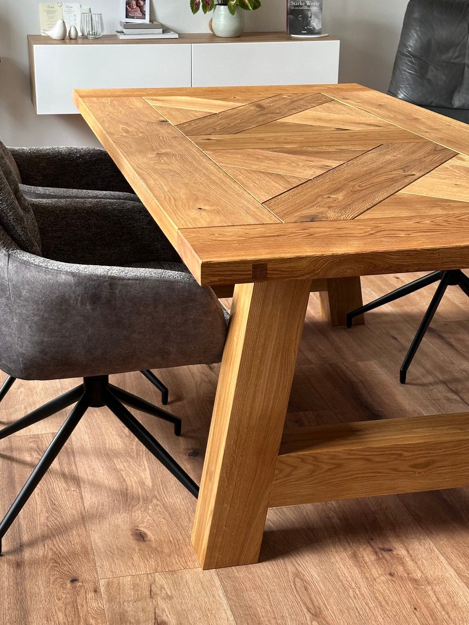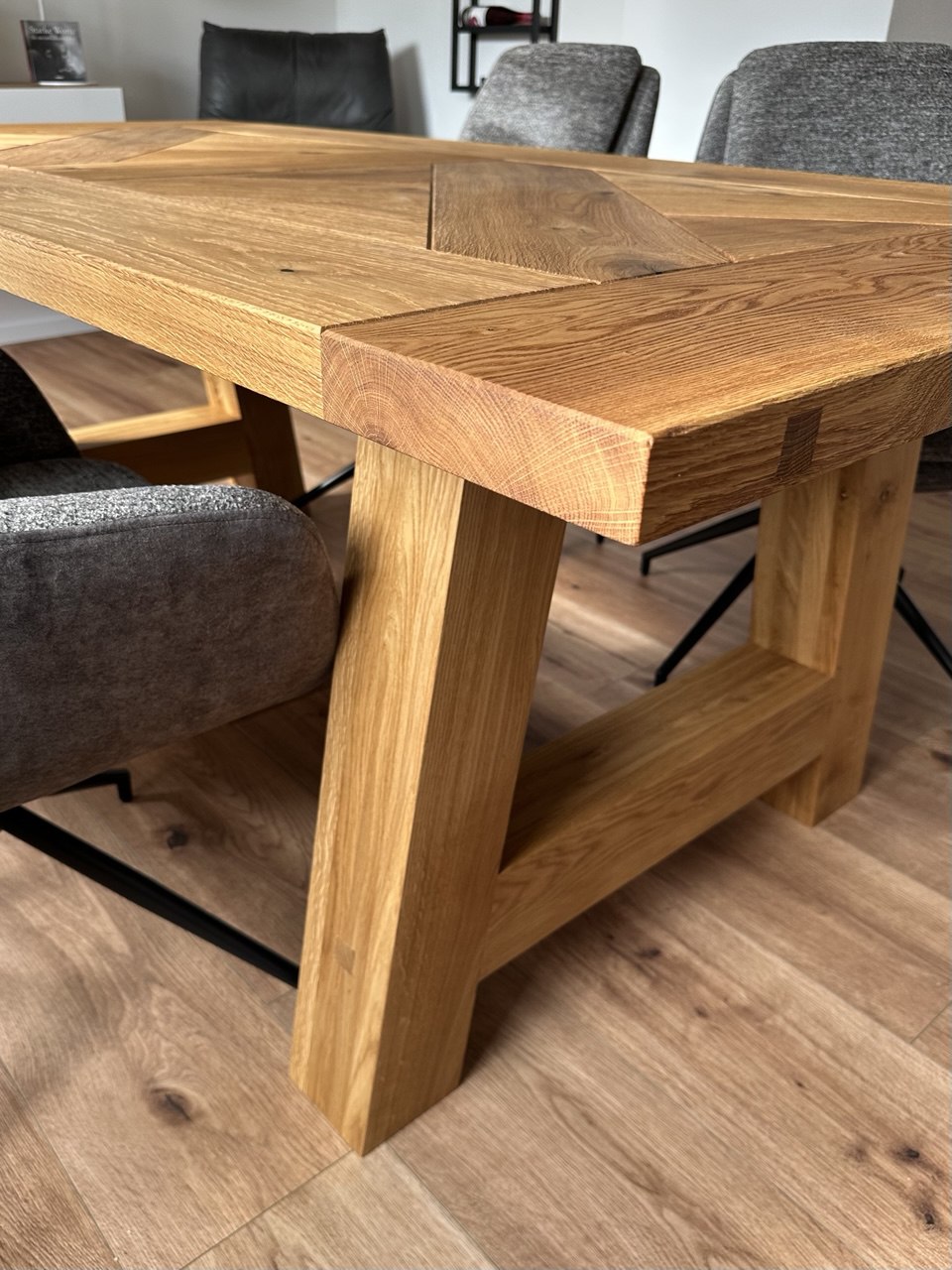 Die 45 mm starke Tischplatte aus massiver Eiche sorgt für Stabilität und natürliche Wärme im Raum.